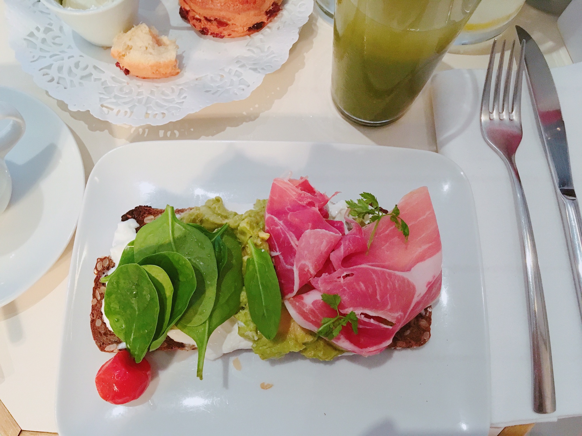 続いて、ポーチドエッグにアボカドペーストやルッコラ、生ハムが、ノルディックブレッドといってナッツや穀物が入った栄養バツグンのパンの上にのった食べ応えのある一皿。