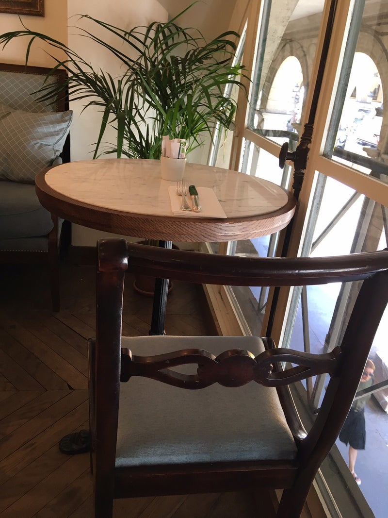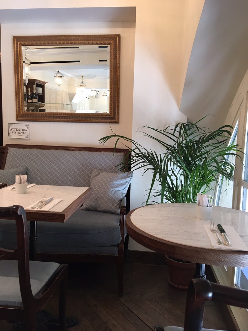 ディスプレイのかわいらしさにトキメキました。テラス席も気持ち良さそうでしたが、5月下旬のパリは暑かったので店内へ。